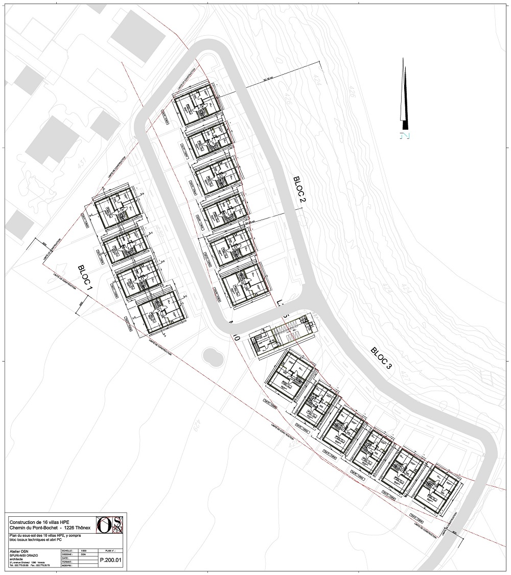 Projet de construction de 16 villas type HPE avec couvert à voiture, place de jeux et espace vert, parking et un local technique enterré.